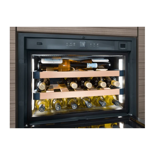 Capacité de conservation optimale pour 18 bouteilles format Bordeaux, avec la possibilité d’y placer des bouteilles plus longues horizontalement.Température réglable de +5°C à +20°C pour une conservation parfaite de vos vins rouges, blancs ou rosés.Équipée de clayettes en bois coulissant sur des rails télescopiques, permettant un accès facile à vos bouteilles sans effort.Eclairage LED avec intensité gradable, créant une ambiance unique tout en vous permettant de visualiser vos sélections.Technologie de réfrigération avancée avec un système anti-vibration pour préserver la qualité de votre vin.