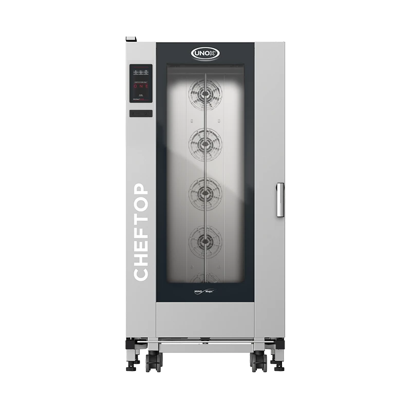 Fiable et professionnel, le four mixte à chariot 20 niveaux d’Unox de la gamme ChefTop Big est construit entièrement en inox et possède une large enceinte de cuisson compatible avec un chariot 20 niveaux.