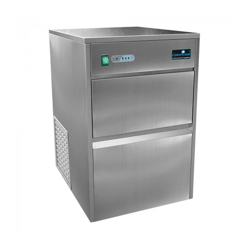 les appareil à glaçons CaterCool est refroidie par air et fonctionne selon le soi-disant système d’injection, ce qui signifie qu’il y a peu de pièces mobiles, la machine est livrée avec un tuyau d’alimentation et de décharge, une pelle à glace et des pieds réglables