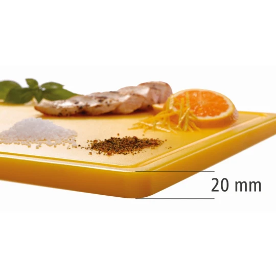 Hygiène garantie avec la série de planches à découper PRO – des planches à découper de différentes couleurs pour les différents groupes d’aliments. La planche à découper jaune conforme HACCP est conçue pour la découpe de la volaille.