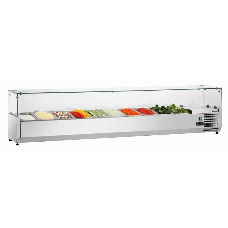 La conception soignée de notre présentoir permet une intégration aisée dans tout espace de travail, avec ses dimensions prévues pour le contexte professionnel : L 2000 x P 340 x H 425 mm. L’absence de bacs GN fournis offre aux chefs la liberté de personnaliser leur espace selon les besoins spécifiques de leurs établissements.