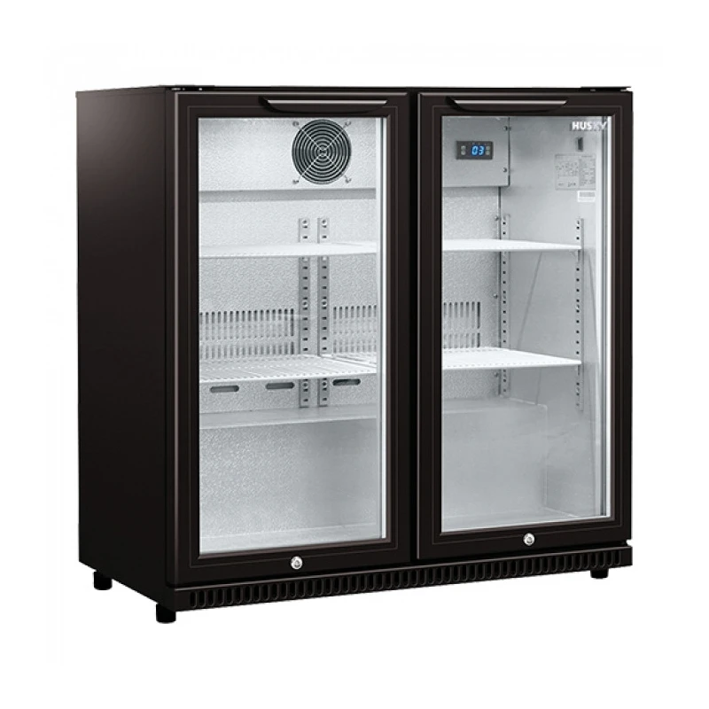 noir, tôle étuvée pour réfrigère par exemple des bouteilles et boites, thermostat réglable digitale +2°C/+10°C, avec ventilateur pour circulation, deux grilles (35x40cm) par porte et illumination intérieur, la porte ferme automatiquement