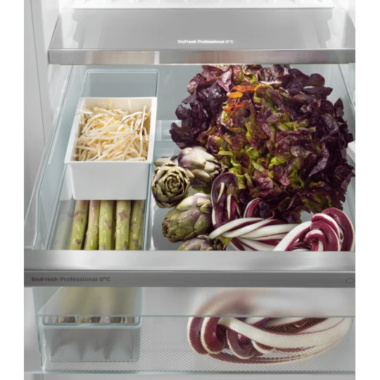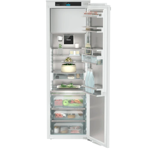 Ce Réfrigérateur Combiné encastrable, modèle IRBdi 5181-22 de la marque Liebherr, incorpore une multitude de fonctionnalités haut de gamme pour une conservation optimale de vos aliments. Son intérieur SmartSteel, non seulement offre un aspect hygiénique et professionnel, mais minimise également les traces de doigts, facilitant ainsi le nettoyage. Les colonnes lumineuses LED, combinées à l’éclairage d’ambiance, garantissent une visibilité parfaite à tout moment. La fermeture douce de la porte grâce au SoftSystem, ainsi que les tiroirs BioFresh Professional sur rails SoftTelescopic, assurent une manipulation aisée et une fraîcheur prolongée. Le Fish & Seafood-Safe permet de conserver poissons et fruits de mer dans des conditions optimales.
