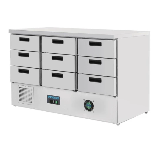 La Table Réfrigérée Positive Polar série G est une solution incontournable pour les cuisines professionnelles. Ce modèle est doté de 9 tiroirs spacieux, offrant une gestion optimisée de l’espace et une préservation méticuleuse des aliments. Chaque tiroir a la capacité de contenir un bac gastronorme GN 1/1, facilitant ainsi l’organisation et l’accès rapide aux ingrédients.