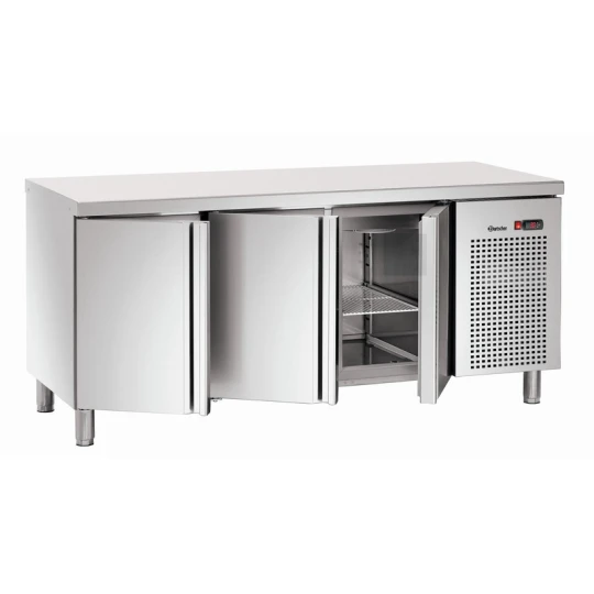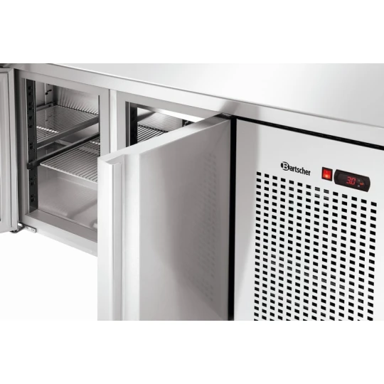 Table réfrigérée à 3 portes avec plan de travail en acier inoxydable de qualité supérieure et un grand espace réfrigéré par ventilation – température de réfrigération constante et homogène à l’intérieur.