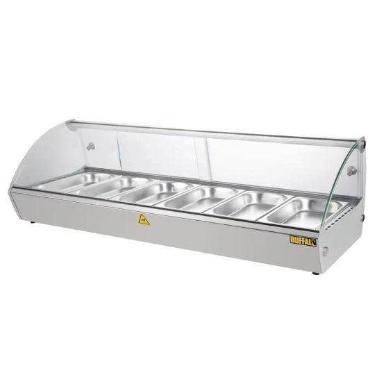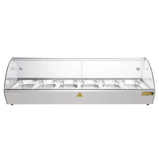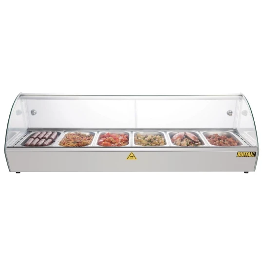 Pour vos buffets ou le snacking, la vitrine chauffante Buffalo est la solution idéale pour présenter de façon attrayante des aliments chauds. Pouvant accepter jusqu’à six bacs GN 1/3, cette vitrine offre beaucoup d’espace pour vos préparations, maintenues de façon hygiénique derrière les parois vitrées. L’accès se fait par des portes vitrées coulissantes à l’arrière, tandis que les aliments sont conservés à la température idéale grâce au thermostat facile à utiliser.