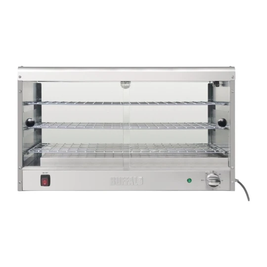 Vitrine chauffante de comptoir en acier inoxydable. Hygiénique et facile à nettoyer avec des portes coulissantes en verre pour un accès aisé. Eclairage intérieur et bac à eau pour créer de l’humidité empêchant les aliments de se dessécher. Trois étagères amovibles.